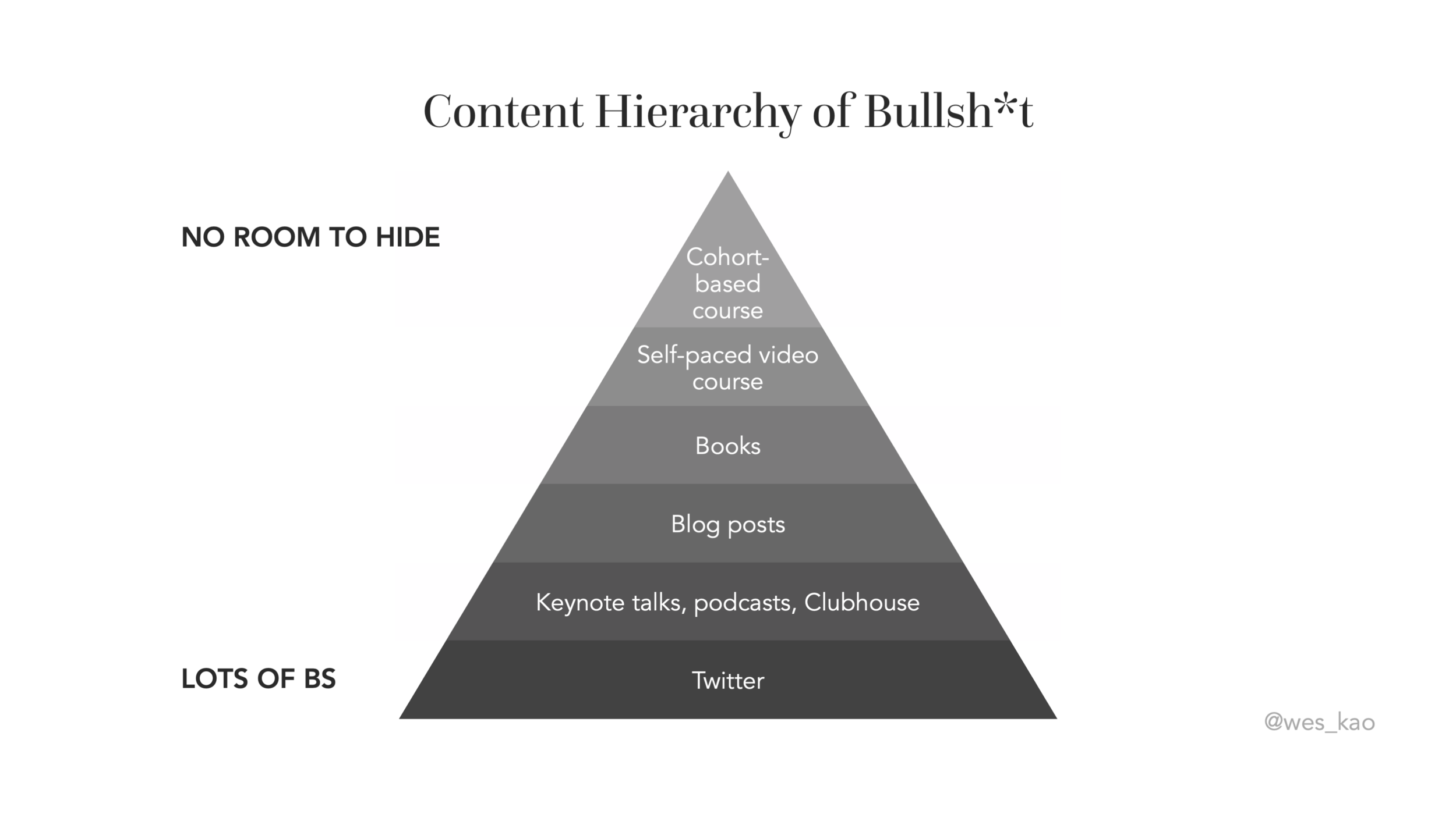 At the very top of the hierarchy lies cohort-based courses. Here, there’s absolutely no room for BS. Unlike MOOCs where students can’t ask questions or object to discussions, you need to back up what you’re saying in a cohort-based course or you’ll lose control of the class.